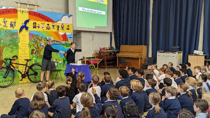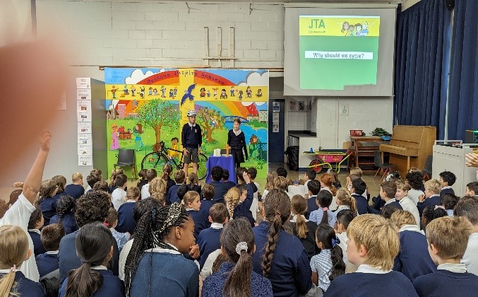 Our Junior Road Safety Officers, Sam and Ronnie, led two assemblies this week to encourage us all to travel actively to school every day. In a whole school assembly Sam and Ronnie talked about the benefits of walking to school. One benefit they emphasised was walking, cycling or scooting instead of travelling by car means there is less pollution. This creates a cleaner, healthier air for everyone to breathe. This reminds us of Article 24 in the UNCRC: Every child has the right to good quality health care and a clean environment.